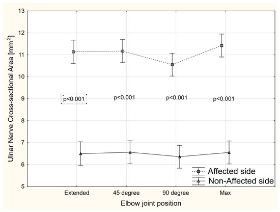 There were significant side-to-side differences (ANOVA, F = 168.2, p < 0.001) in the ulnar nerve CSA value at each elbow position (extended, 45°, 90°, and maximal elbow flexion) (Figure 4). Compared to the non-affected side, the mean CSA on the affected side was higher by 6.63 mm2 (95% CI 4.10–5.16), 4.61 mm2 (95% CI 4.07–5.13), 4.19 mm2 (95% CI 3.66–4.72), and 4.87 mm2 (95% CI 4.33–5.39) for extended elbow, 45° of elbow flexion, 90° of elbow flexion, and maximal elbow flexion, respectively.