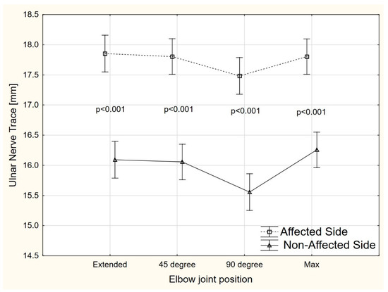 There were significant side-to-side differences (ANOVA, F = 54.2, p < 0.001) in the ulnar nerve TRACE value at each elbow position (extended, 45°, 90°, and maximal elbow flexion) (Figure 5). Compared to the non-affected side, the mean TRACE on the affected side was higher by 1.76 mm (95% CI 1.14–2.12), 1.74 mm (95% CI 1.38–2.11), 1.93 mm (95% CI 1.56–2.29), and 1.54 mm (95% CI 1.18–1.90) for extended elbow, 45° of elbow flexion, 90° of elbow flexion, and maximal elbow flexion, respectively.