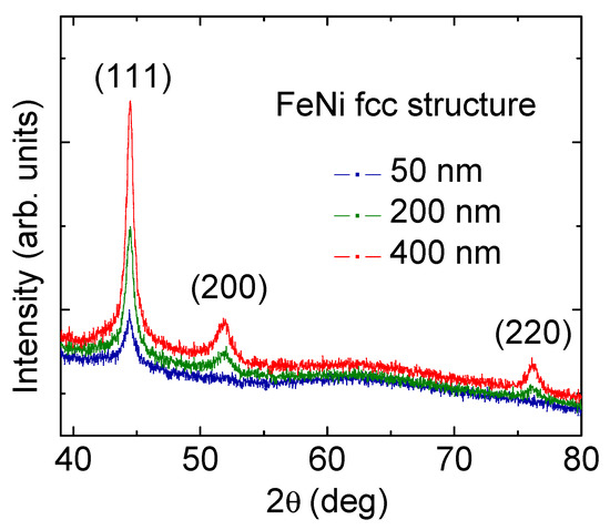 The X-ray diagrams for the FeNi films confirm the fcc crystalline structure of all samples under consideration (Figure 1). The presence of an (111) intense peak is a characteristic feature of the diffractograms obtained for all studied films. An increase in the film thickness is accompanied by an increase in the intensity of the (111) and (200) peaks.
