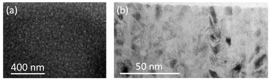 The phase analysis and average grain size was defined by X-ray diffraction technique (XRD) using a PHILIPS X’PERT PRO automatic diffractometer (Pan Analytical, Cambridge, UK) operating at 40 kV and 40 mA with Cu-Kα radiation (wavelength λ = 1.5418 Å). The configuration used for XRD studies has been theta-theta Bragg-Brentano. The particular configuration was selected as the main objective has been to irradiate the maximum sample volume to obtain the maximum signal intensity. This geometry allows the correct evaluation of the full width at half maximum (FWHM) for later size estimations. The identification of the initial phases was performed using High Score program and the powder diffraction file (PDF). The structure of the films was studied also by transmission electron microscopy (TEM) using a Hitachi HT 7700 microscope (Hitachi HT, Tokyo, Japan) and scanning electron microscope (SEM) JEOL JSM-640 (JEOL, Freising, Germany), SEM images were acquired in secondary electrons.