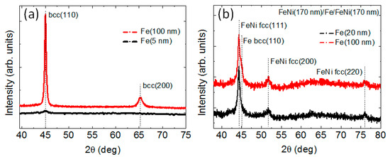X-ray diffraction pattern for Fe films (a) and FeNi(170 nm)/Fe(lFe)/FeNi(170 nm) trilayers (b).