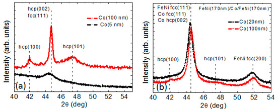 The high degree of texturing observed for thin Co films did not allows us to unambiguously determine the lattice type, namely, cubic or hexagonal (Figure 4a). The metals growing incoherently on the substrates are known to prefer the close-packed orientation, like (111) plane for the fcc structure [22]. It therefore can be supposed that in thin cobalt films, both cubic and hexagonal phases can be present. The appearance of the hcp (100) and hcp (101) peaks for thicker Co films testifies the increase of the relative amount of the hexagonal phase with the increase of the Co film thickness.