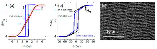 The critical thickness for FeNi films was close to 200 nm. Thinner films had uniaxial magnetic anisotropy with the anisotropy axis oriented in the sample plane (Figure 5a). The easy magnetization axis coincided with the orientation of the magnetic field applied during thin film deposition. The coercive force Hc of such films did not exceed 1 Oe, and the anisotropy field Hk was about 4 Oe.