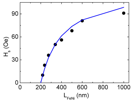 An analysis of hysteresis loops allows us to determine another important magnetic characteristic, namely, the saturation field Hs (Figure 5b). For the “transcritical” films [23,24,25], the relationship between the saturation field and the film parameters was previously described by Murayama’s equation [26,27]: