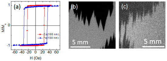 Hysteresis loops measured along easy magnetization axis for Fe (100 nm) and Co (100 nm) films (a). Images of the magnetic domain structure for Fe film (b) and Co film (c) obtained near Hc after magnetization of the samples to saturation along the easy magnetization axis (EA). The application axis of the external field is parallel to the EA and vertical sides of the images.