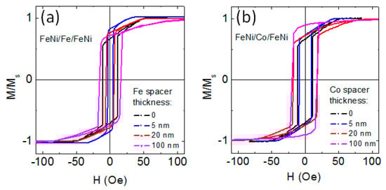Magnetic hysteresis loops of FeNi(170 nm)/Fe/FeNi(170 nm) (a) and FeNi(170 nm)/Co/FeNi(170 nm) (b) trilayers with different thicknesses of Fe and Co spacers indicated by the legends.