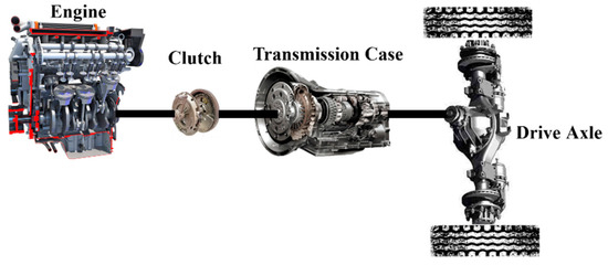 The main research object of this paper is a four-wheel truck whose structure is shown in Figure 1. This vehicle consists of the engine, clutch, transmission, drive axle, and other components. The engine is the only power source to provide the vehicle driving energy. The vehicle is equipped with a six-speed gearbox to realize everyday driving under multiple working conditions according to information such as vehicle speed and power while improving the engine’s working point and optimizing the engine’s efficiency to a certain extent. Table 1 shows the information on the vehicle parameters of the four-wheeled truck.