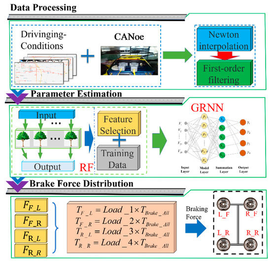 For the complex braking force system of four-wheeled trucks and the state of the vehicle and the working state of components present complex nonlinear operating characteristics, this paper proposes a machine-learning-based regression of the vehicle parameters to achieve the accurate estimation of the complex nonlinear parameters of the vehicle and improve the accuracy of the vehicle in the braking decision to give full play to the potential of the independent braking force. The architecture diagram is shown in Figure 4. Firstly, the CANoe adopted to collect information in the actual driving process of the vehicle to establish the data module. Secondly, a large number of data sets for the subsequent machine learning model training brings a huge amount of computation, the use of random forest (RF) method for the data set feature screening to reduce the dimensionality of the data and reduce the computational load. Finally, the estimation of complex nonlinear parameters of the vehicle are achieved by using generalized regression neural network (GRNN). Through the data-driven approach, the accurate estimation of the vehicle state parameters of the truck is realized, and the potential of the independent braking of the truck is fully utilized to improve the stability and safety.