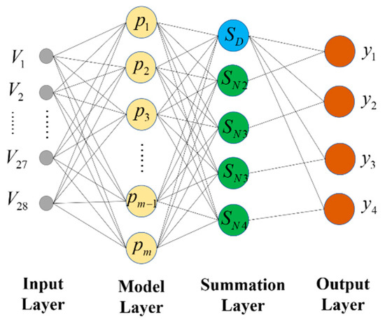 The summation layer has two different ways of summing the neurons. One type of summation calculation is the arithmetic sum of the output of the mode layer with a connection weight of 1 for the mode layer and each neuron. The transfer function is shown in Equation (22). The other type of summation is calculated as a weighted sum of the neurons in the mode layer, and the transfer function is shown in Equation (23).