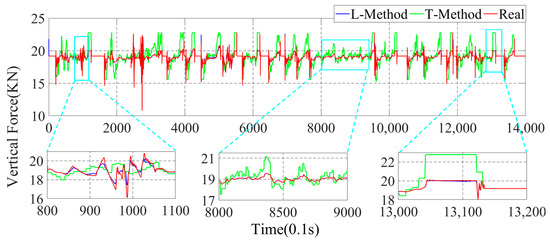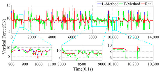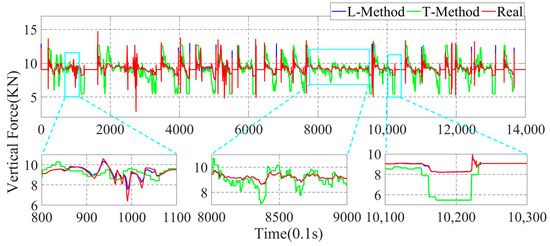 In the above simulation results, the parameters estimation of the four-wheel vertical force of the vehicle based on the data-driven machine learning has perfect estimation accuracy, and it can be seen from Figure 11, Figure 12 and Figure 13 that the parameters estimation method based on the L-Method performs significantly during the driving process, and the trend of the estimated four-wheel vertical force is highly consistent with the actual four-wheel vertical force of the vehicle. Then, the T-Method has a relatively large error in the estimation of the four-wheel vertical force of the vehicle, and the estimation effect has low accuracy. In the 80.0 s–110.0 s interval, the four-wheel vertical force exhibits a certain amplitude of vibration due to the suspension of the vehicle. In the interval of 800.0 s–900.0 s, the four-wheel vertical forces of the vehicle have a small up-and-down amplitude, and the T-Method has the phenomenon of up-and-down vibration with large error. However, the L-Method shows a better estimation accuracy. In the 1010.0 s–1030.0 s, the L-Method also shows a high estimation accuracy.