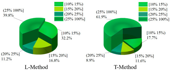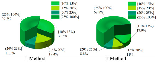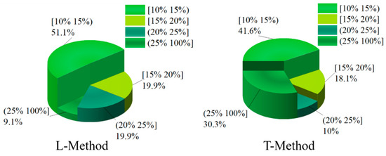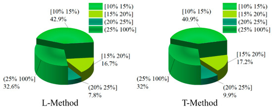 Figure 14 and Figure 15 show the distribution of the slip rate of the left-front wheel and the left-rear wheel under different control strategies. From Figure 14, the percentage of slip rate of the left-front wheel in the range of [15–20%] is 18.1% based on the T-Method. However, the percentage of slip rate of the left-front wheel in the range of [15–20%] is 19.9% based on the L-Method strategy, which has a better braking force effect. The slip rate in (25–100%] indicates that the wheel has obvious slippage, which seriously affects the braking effect of the vehicle, and the left-front wheel slip rate in the T-Method-based method occupies 30.3% in this interval. In contrast, based on the L-Method only occupies 9.1% in this interval, the braking force distribution strategy performs better. In addition, in the interval [20–25%], the percentage of left front wheel slip under the L-Method-based approach is still higher than that under the T-Method strategy.