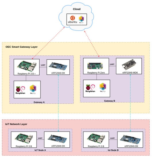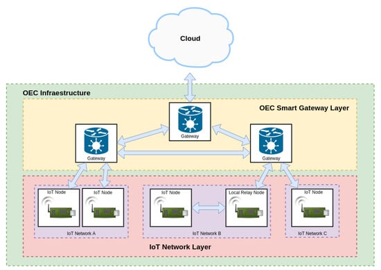 - OEC Smart Gateway Layer. This layer consists of OEC gateways that have the ability to provide opportunistic services to the deployed IoT nodes with reduced latency thanks to the proximity to them. Moreover, smart gateways can collaborate among them in order to perform more complex tasks or to exchange data from different IoT networks without making use of the Cloud Layer.