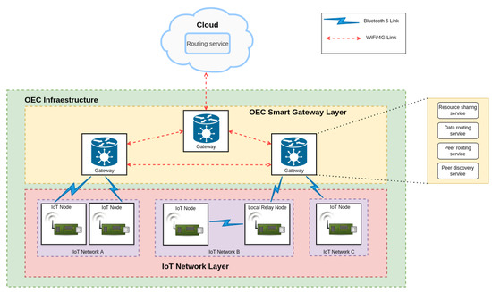 The two upper layers of the architecture provide different essential services. In the case of the OEC Smart Gateway Layer, it provides peer discovery, peer routing, data routing and resource sharing services. Regarding the Cloud Layer, it provides the routing service that enables communicating between different IoT networks whose gateways are not connected with each other (either directly or through other gateways).