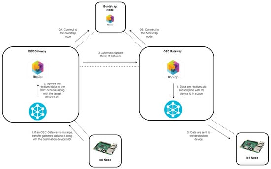 - Finally, the OEC gateway that is located in the same opportunistic network as the IoT destination node, collects the sent data from the DHT network and delivers the message to the IoT node over Bluetooth 5 (using BLE). The time required for performing such operations is called .