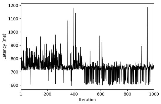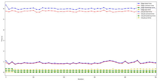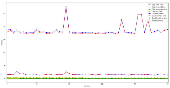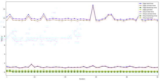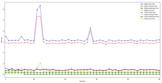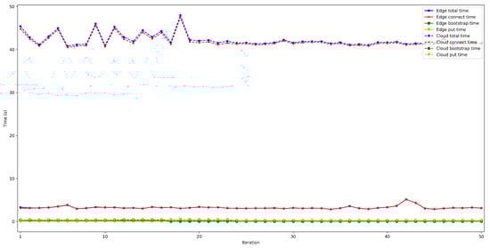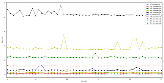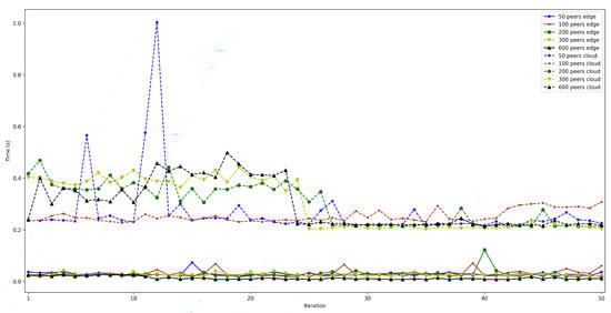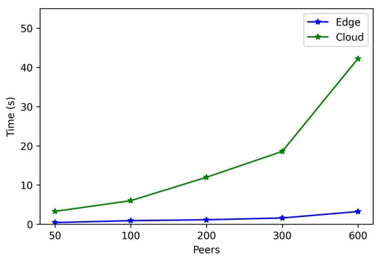 - . This latency was measured in the same way as for . The obtained results show a latency that oscillates between 100 and 150 ms for the edge scenario and between 200 and 1000 ms for the cloud scenario. In addition, the performed experiments allowed for concluding that this latency does not depend on the number of connected peers.