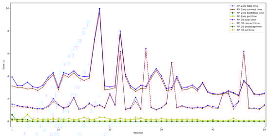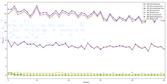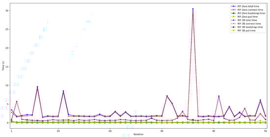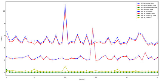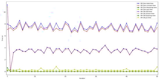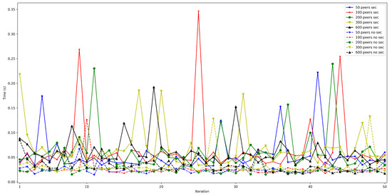 - . In order to measure this latency, tests were carried out in several scenarios and under different network layers (e.g., edge and cloud), different hardware (e.g., Raspberry Pi 3B, Raspberry Pi Zero) and different security configurations. For each test, 50 iterations were made and five situations were measured with 50, 100, 200, 300, and 600 peers connected to the network. The performed experiments showed a constant latency of roughly 50 ms, independently of the scenario.