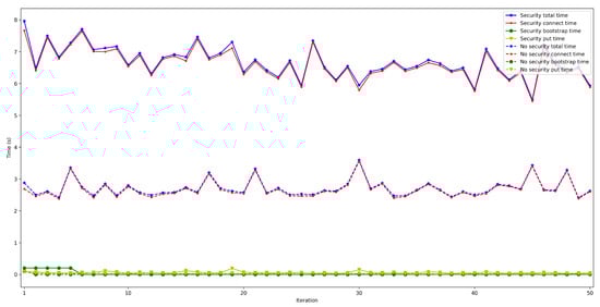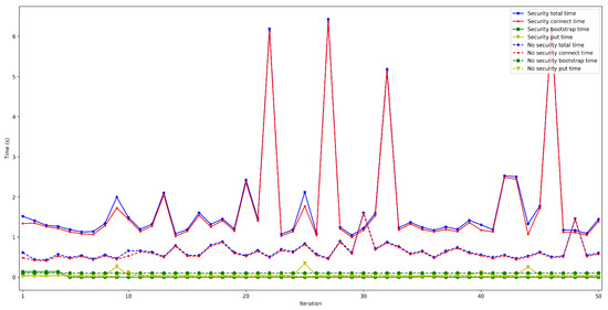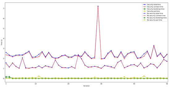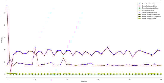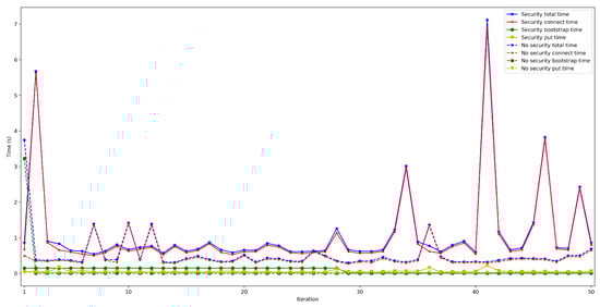 Finally, Figure 28 and Figure 29 show the put and connection times for scenarios when 50 to 600 peers are connected to the bootstrap node and when security was or was not enabled. Specifically, Figure 28 shows that put times with security enabled are constant and independent from the number of peers, remaining between 55 and 60 ms (the same occurs when disabling security, oscillating between 25 and 30 ms). Therefore, the use of security doubles put time, but such a difference is actually low in absolute terms.