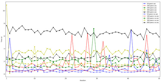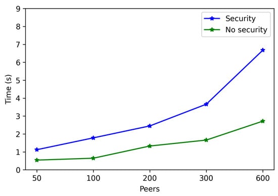 In contrast, Figure 29 shows larger differences for connection time. This is especially noticeable when the number of peers increases, since more time is dedicated to applying TLS 1.3 to establish each peer communication. For instance, the connection time difference between using or not security, for 50 connected peers, is approximately 0.6 s, while the difference for 600 peers is around 4 s.