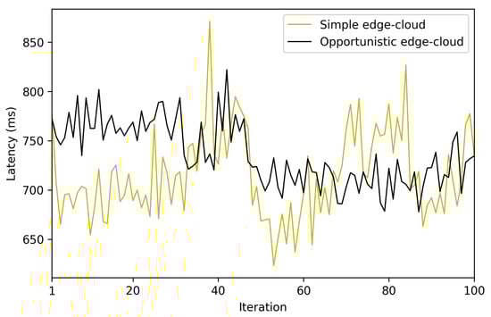 - As was previously mentioned, since most of the reviewed publications did not include latency results, the measurements obtained with the proposed architecture were compared with those of a simplified edge-cloud architecture. In order to perform the comparison, a system was created with the same architecture as the one proposed in Section 3, but without making use of opportunistic algorithms. Thus, in such an architecture an IoT node sends data through Bluetooth 5 to the nearest non-opportunistic gateway, which establishes a P2P connection (using the Cloud as a relay) with a remote gateway that sends the data to the destination IoT node via Bluetooth 5. It is important to note that, in this non-opportunistic architecture, the destination node needs to be always available for receiving data; otherwise, the sent data are lost because the distributed storage of the receiving IoT node is not available. The results of such a comparison are shown in Figure 30. It can be observed that the latency differences between the two compared architectures are small. Specifically, in the case of the opportunistic architecture, the average measured latency is 736 ms, while the non-opportunistic Cloud-based architecture communications have an average latency of 715 ms. Such a 21 ms time difference essentially corresponds to the contribution of to Equation (2). In any case, the observed time difference is so small that most IoT applications will not be aware of the additional latency, while being able to provide all the benefits of using opportunistic communications.