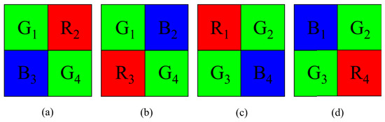 Four 2 × 2 Bayer CFA patterns. (a) = [, , , ]. (b) = [, , , ]. (c) = [, , , ]. (d) = [, , , ].