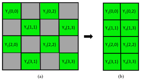 On the other hand, by Equation (1), one input Bayer CFA image is converted into a image which contains four subimages, namely the two luma subimages, and , constituting a quincunx-located luma image in Figure 5a, and the two chroma subimages, and . In order to produce a compact luma image containing and , every luma value in each even column of the quincunx-located image is shifted left to the odd column, and then, each even column is removed. Figure 5b shows the rectangular compact luma image. Next, the rectangular compact luma image is rotated 45 degree clockwise to produce a rhombic compact luma image which is located on the center of the resultant compact luma image using a mirroring method. Finally, the resultant compact luma image is compressed by a shape-oriented JPEG [39], in which only the meaningful luma values of the resultant compact luma image are compressed. Similarly, the compact subimage and the compact subimage are compressed using the same codec.