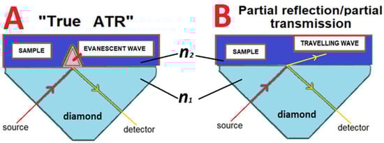 ATR apparatus configuration. (A) “True ATR” mode, with total reflection at the diamond/sample interface, producing an evanescent wave; (B) partial reflection/partial transmission mode, where some of the signal is transmitted into the sample at the diamond (n1)/sample (n2) interface as a continuing travelling wave.