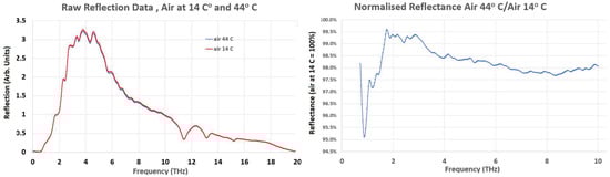 The dielectric parameters of water at THz frequencies are highly temperature-dependent. The n and α of water change in opposite ways: n increases and α decreases as the temperature increases [9,10]. A decrease in α leads to less attenuation in reflection in the “true ATR” mode. Conversely, an increase in n makes the surface more reflective, increasing surface reflection in the partial reflection/partial transmission (PRPT) mode. Thus, with the AS ATR configuration, water, and samples dominated by water, have a pattern of a temperature-dependent increase in reflection as the temperature rises at frequencies under approximately <5 THz and a temperature-dependent reflection decrease at approximately >5 THz.