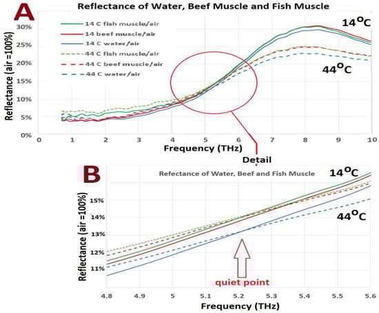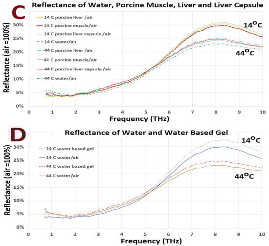 The data for pure water, water-based tissues, and water-based gel are presented in Figure 4. The reflectance data for all samples were normalized to air = 100%. All the water-dominated samples showed a similar pattern, with the temperature-dependent reflection changes (in PRPT mode) following the anticipated main dependence on n at <5.0 THz, and the temperature-dependent reflection changes above 5.0 THz being chiefly dependent on α, in the region of “true ATR”. The crossover “quiet point” proved to be at 5.2 THz. There was a region either side of the “quiet point” where there was a gradation of n vs. α influence. Fish muscle had a higher reflectance when compared to other tissues in the < 4 THz range. The crossover “quiet point” was, however, in the same region as the other tissues.