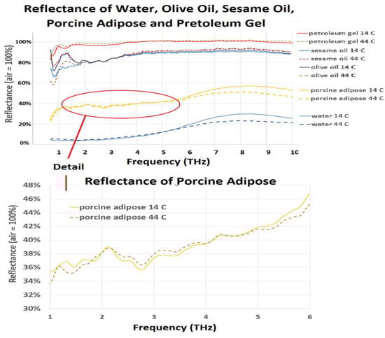 Reflectance data for porcine adipose tissue, olive oil, sesame oil, and petroleum gel are presented in Figure 5. These data were also normalized to air = 100%. The olive oil, sesame oil, and petroleum gel samples do not have the water-like “crossover flare” or “quiet point” feature. From the literature [14,15,16], the refractive index of these substances is in the 1.45 to 1.55 range at THz frequencies. This results in olive oil, sesame oil, and petroleum gel being examined in “true ATR” mode throughout the range. Olive oil and sesame oil exhibit temperature-dependent reflectance increase at <2.0 THz, and, since the ATR apparatus is operating in “true ATR” mode, this indicates a temperature-dependent α increase in that region. This matches observations by other investigators [17]. The temperature-dependent spectra of olive oil and sesame oil show a wide divergence between the 14 °C and 44 °C in the 1.0 THz to 2.0 THz range, and an uneven reflectance gradient throughout the 0.7 THz to 10.0 THz range.
