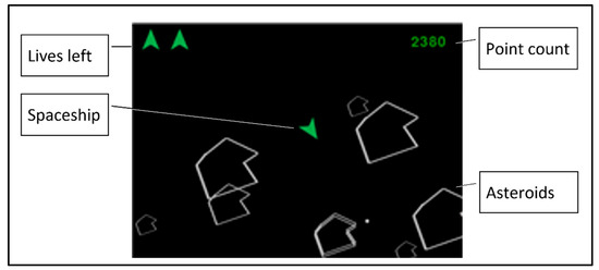 A two-dimensional Asteroids computer game (downloaded from: https://github.com/aminb/asteroids (accessed on 14 January 2018), see Figure 2) was altered so that it would have 3 possible conditions: constant difficulty level (hereby referred to as “control-constant”), difficulty level that increases with time (hereby referred to as “control-time”), and difficulty level that varies according to the stress level calculated from the grip force (hereby referred to as “stress-adaptive”). Of the valid 52 participants, 41% were in the “stress-adaptive” condition, 31% were in the “control-constant” condition and 28% in the “control-time” condition.
