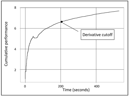 Learning curve for a single participant. X axis represents time (s), Y axis represents performance [Ln (cumulative hits − 10 * cumulative loss of lives)]. Black dot represents the first derivative cutoff point.