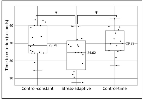 From Figure 4, one can notice that the stress-adaptive group showed the shortest required time to achieve the criterion compared with both the control-constant and the control-time. A near-significant effect was found in an LMM analysis for time to criterion F(2,49) = 2.98, p = 0.06. The adjusted R2 squared was 0.07. A significant main effect of the stress-adaptive condition was found: t = −2.12, p = 0.039, which indicates the difference between it and the two control conditions.