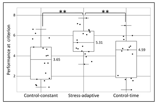 Performance at criterion as a function of group. Dots represent the “performance at criterion” parameter (from the first derivative cutoff points) for all 52 participants, grouped according to their experimental condition (control-constant, stress-adaptive, and control-time). Boxes represent the inter-quartile range (IQR = Q1 to Q3) of the group, middle horizontal line represents the group’s median, upper line represents the largest value less than upper quartile plus 1.5 times IQR, and the lower line represents the smallest value greater than lower quartile minus 1.5 times IQR. Two asterisks represent significance level of p ≤ 0.01.