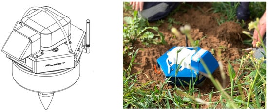 IoT can be described as a system of intelligent computing devices that transfers data over a network without human interaction []. In recent years a new type of IoT connectivity has emerged that utilises low-Earth orbit satellite constellations to provide global connectivity: Direct-to-Satellite IoT (DtS-IoT, see Fraire et al. [] for a review). This solution is ideal for ambient seismic noise tomography stations, as it enables us to conduct ambient noise tomography at low cost anywhere on Earth with compact and agile devices that do not require a base station. A schematic of the design of the Geode is shown in Figure 1 alongside a picture of the Geode installed in the field. The components contained in the Geode (from top to bottom) are the satellite modem, battery pack, enclosure housing the electronics and sensor digitiser, single-component geophone element and spike. To enable the use of DtS-IoT, we reduce the data volumes by performing data pre-processing (or edge computing) directly on the Geode microcontroller (similar to [,,]). It is important to note that the utilisation of edge-processing is main differentiating factor between IoT-enabled seismic devices and conventional real-time seismic stations that utilise cellular or satellite telemetry. The Geode also contains a LoRa antenna for in-field quality control and diagnostics. As currently configured the Geode weighs just under 9 kg and has a battery life of approximately 40 days, which fulfils our design requirements. The size and weight of the Geode can be reduced by either designing for a shorter battery life or building a modem with lower power consumption, which we are actively working on.