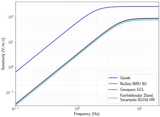 Although the central frequency of the geophone plays an important role in the frequencies one can retrieve, some authors have reported that one can record signals as low as 0.1 Hz from teleseismic earthquakes with 5 Hz geophones, even though Figure 2 indicates that the sensitivity of these geophones are more than 1000 times less than 5 Hz at these frequencies [,]. In mineral exploration, we typically use frequencies between 0.1 and 10 Hz for ambient seismic noise surface wave tomography. Theoretically one can use a lower frequency geophone element with higher sensitivity to improve the retrieval of low frequency ambient noise [], however we did not find any studies on the effects of higher sensitivity and lower frequency geophone elements on the retrieval of cross-correlation functions and the impact on signal-to-noise ratios. Some of the nodal seismic devices allow for the use of an external sensor (e.g., the Nuseis NRU KCK), which could be used with an external sensors such as the SeisTech ST-2A 2 Hz Geophone with KCK connector for further research into the utility of low frequency nodes for ambient noise tomography. Alternatively, some manufacturers have designed nodes with circuits that electronically extend geophone elements to a wider bandwidth and higher sensitivity (e.g., the SmartSolo IGU-BD3C-5).