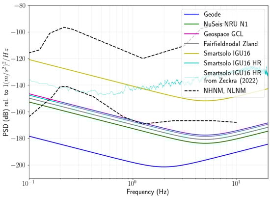 In Figure 3, we show a comparison of the theoretical noise floor of several popular nodes compared to that of the Geode. For these graphs we used the specifications from the suppliers to calculate the theoretical self-noise at the lowest programmable sampling rate and the highest gain along with the global lower noise model (NLNM) []. The figure also includes the measured self-noise of the Smartsolo IGU16 HR node from Zeckra et al. [] using the method from Sleeman et al. [] for the same recording parameters. Although the theoretical noise floor of the traditional nodal geophones is below the NLNM for much of the frequency band of interest, we see that the measured self-noise for the Smartsolo IGU16 HR 5 Hz is higher than the theoretical noise floor (between 10 dB and 45 dB higher) and in fact above the NLNM for nearly the entire frequency band of interest. The difference between the theoretical and actual noise floor is to be expected, since the theoretical calculation does not take some secondary effects, such as electromagnetic interference, into account. Additionally, it was assumed that the equivalent input noise of the device is frequency independent since the value is typically not reported for different frequencies by manufacturers. Possible other causes for the higher measured noise floor may be the effect of installation tilt on the geophone sensitivity.