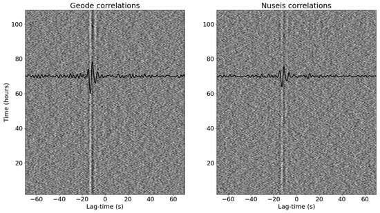 Comparison of the correlation functions for the Geodes compared to the Nuseis nodes. The waterfall plot shows the correlation function for each 20 min segment, while the black line shows the stacked correlation function.