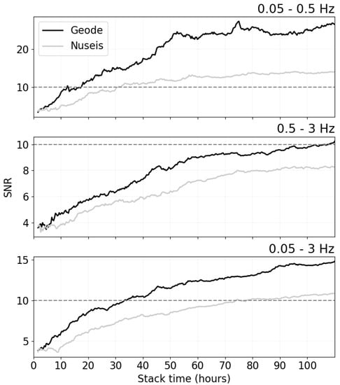 Most ambient noise tomography studies only make surface wave dispersion measurements on cross-correlation functions with SNR of 10 or higher [,]. Bearing this in mind, the implications of the increased SNR for the Geode compared to conventional nodal devices are significant. In this particular case, the required recording time is reduced from approximately 75 h to less than 35 h when considering the entire measurable frequency band. We also note that the SNR for the Nuseis nodes in the high frequency band (0.5–3 Hz) only reaches an SNR of just over 8 during the 110 h recording period.