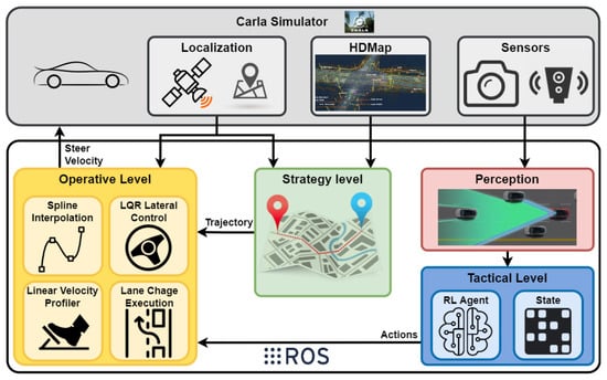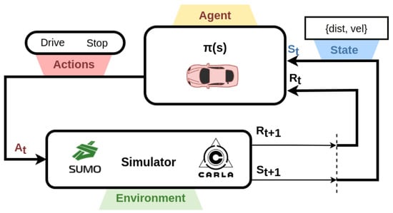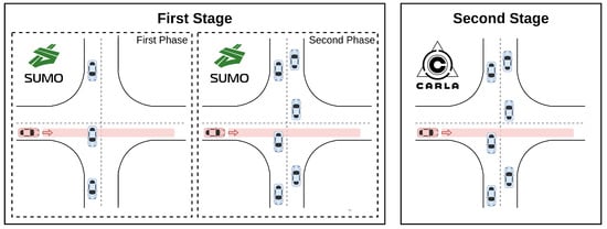 - Dosovitskiy, A.; Ros, G.; Codevilla, F.; Lopez, A.; Koltun, V. CARLA: An Open Urban Driving Simulator. In Proceedings of the 1st Annual Conference on Robot Learning, Mountain View, CA, USA, 13–15 November 2017; Volume 78, pp. 1–16. [Google Scholar]