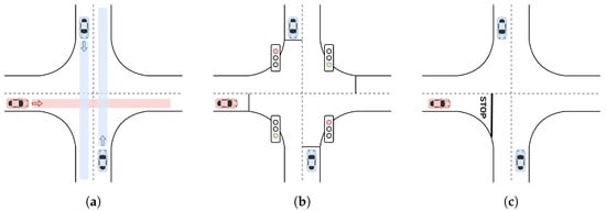 - Aoki, S.; Rajkumar, R. V2V-based Synchronous Intersection Protocols for Mixed Traffic of Human-Driven and Self-Driving Vehicles. In Proceedings of the 2019 IEEE 25th International Conference on Embedded and Real-Time Computing Systems and Applications (RTCSA), Hangzhou, China, 18–21 August 2019; pp. 1–11. [Google Scholar] [CrossRef]