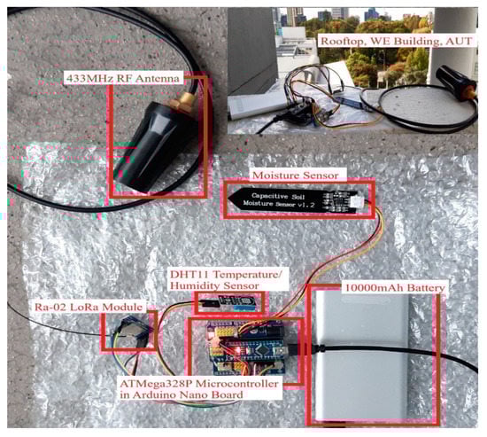 Figure 4 shows the deployment of the LoRa transmitter node–02 at the rooftop of the University building. An additional transmitter node–02 was designed to assess the productivity of the transceiver system in open-air conditions. The structure of the transmitter node–02 is practically the same as transmitter node–01, and the progressions made for this node is the utilization of different sensors. In transmitter node–02, the sensors that are associated with the microcontroller are the DHT11 temperature-humidity sensor and capacitive soil moisture sensor. The considerable achievement of the temperature-humidity sensor is that it can refresh the reading every 2 s. This low-cost, efficient sensor conveys a digital signal on the data pin. The capacitive soil moisture sensor provides information on the volumetric water content in the soil and is compatible with any type of microcontroller.