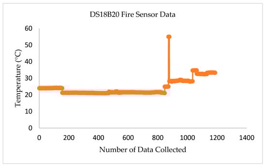 Figure 5 shows the laboratory test results for the DS18B20 Fire Sensor. More than 1000 data sets were collected from every sensor node to evaluate the time efficiency and data accuracy of the transceiver system. The fire sensor in transmitter node–01 delivers the temperature (measured in Celsius). If the temperature inside the building abnormally rises, a warning sound is activated in the sensor to notify the incident. The collected data indicate that this sensor provides the ordinary room temperature of 20 to 25 °C. For testing the accuracy and response of the sensor, a manual flame was placed near the sensor, and the temperature level was recorded at about 55 °C.