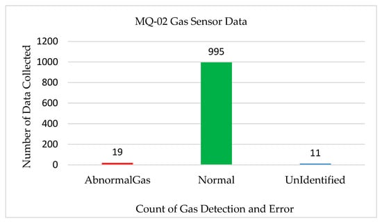 Figure 7 shows the test results for the gas sensor. To analyze the system efficiency, we recorded 1025 sensor data sets using the MQ-2 gas sensor. We manually inserted smoke and gases into the system and performed various tests for system accuracy. We observed that for 1025 sensor data sets, the system identified 19 instances of abnormal gases and 11 cases of no gases. The system accuracy was found to be 99% with an error rate of 1%.