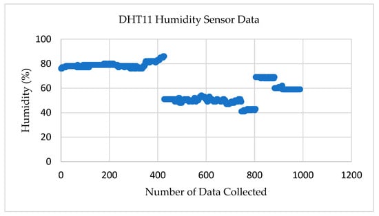 Figure 9 shows the test results for the DHT11 humidity sensor. The humidity sensor is also part of the temperature sensor in transmitter node–02, but this sensor delivers the atmospheric humidity level. The sensor measures the relative humidity (RH) in percentage by calculating the amount of water content present in the atmosphere. The data were collected by placing the transmitter node–02 in various locations. The sensor reading showed that the dissimilarity in the values according to the location change.