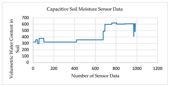 Figure 10 shows the data collected from the soil moisture sensor. The capacitive soil moisture sensor is another sensor included in the transmitter node–02. This sensor measures the volumetric water content in the soil.