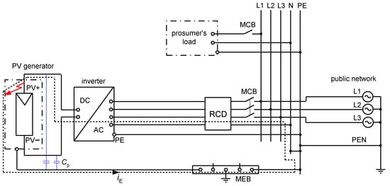 An example installation with photovoltaic (PV) sources of energy and earth fault current iE flow in the case of the earth fault at the DC side. RCD—residual current device, MCB—circuit-breaker, MEB—main equipotential bonding busbar, Cp—capacitance-to-earth in a PV installation.