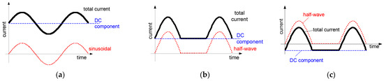 Composite waveforms of earth fault currents (“total current”) in the coupled DC–AC systems. Components: (a) sinusoidal AC + smooth DC; (b) pulsating half-wave + smooth DC of same polarity; (c) pulsating half-wave + smooth DC of opposite polarity.