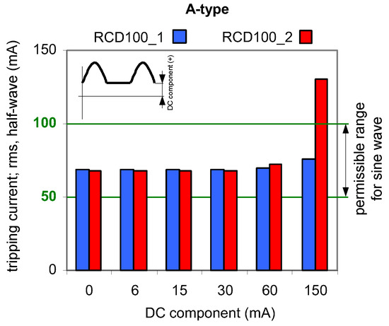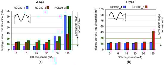 F-type 30 mA RCDs (Figure 6b) have better immunity to the DC component (compared to A-type 30 mA). For device RCD30_4, the tripping rms value of the AC sinusoidal component is below I∆n = 30 mA even when the DC component is five times higher, i.e., 150 mA.