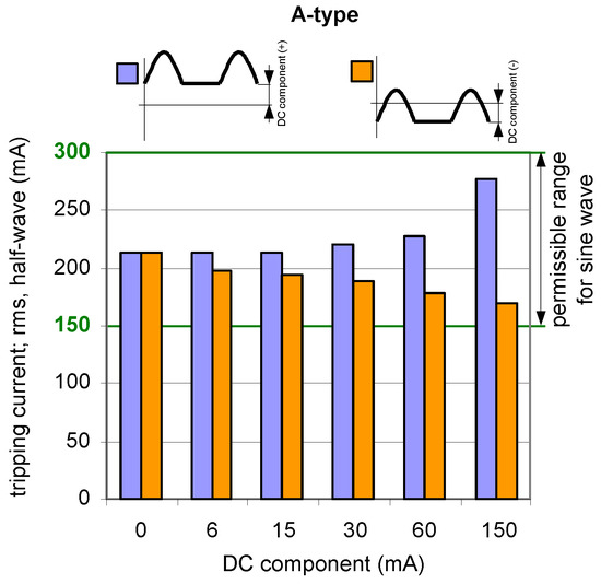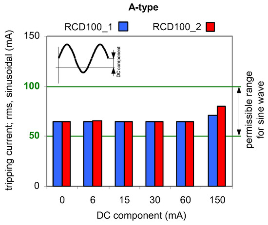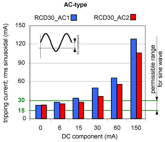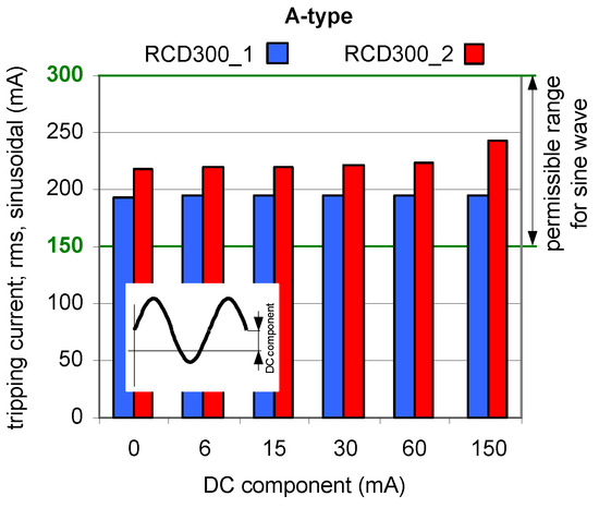 The results obtained for 100 mA RCDs (Figure 7) and 300 mA RCDs (Figure 8) show that for all values of the DC component the rms values of the AC sinusoidal component which is responsible to initiate tripping of RCDs are within (0.5–1.0)I∆n. This behavior of the RCDs is very favorable. The comparison of the results for 30 mA vs. 100 mA, and vs. 300 mA RCDs shows that the ratio of DC component/rated residual operating current I∆n is important. The RCDs with a greater value of I∆n will be relatively more resistant to a DC component of a given value.