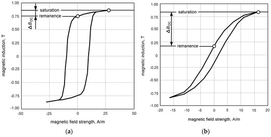 Magnetization characteristics (measured, for 50 Hz) of current transformer cores from RCDs: (a) AC-type (here called round hysteresis loop); (b) A-type (here called flat hysteresis loop). ∆BDC—variation of the induction between the remanence point and the saturation point.